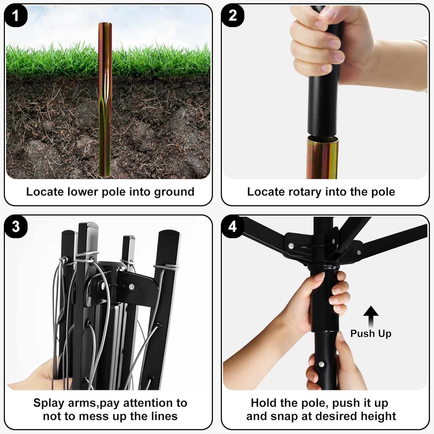 - Easy Installation: The umbrella clothes line comes with instructions for easy installation. The outside clothes line drying rack can be easily folded and stored, compact and space-saving.