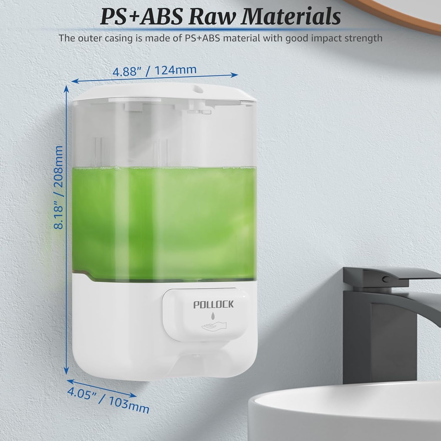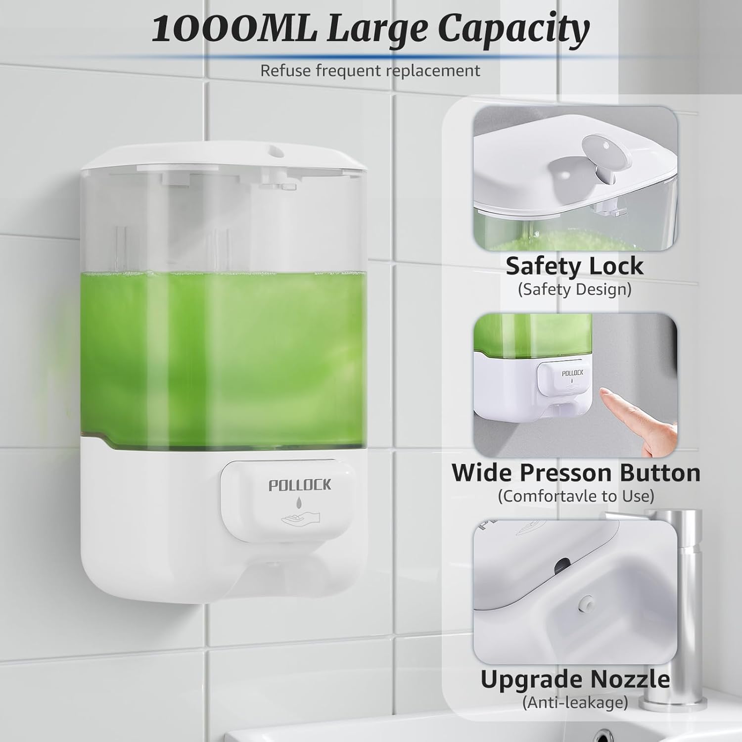 - 1. Large Capacity: One push button dispensing, easy to use. With a generous 33.8 oz (1000ml) capacity, the wall soap dispenser can holds more soap, reducing the need for frequent refills. Perfect as a home or commercial soap dispenser.