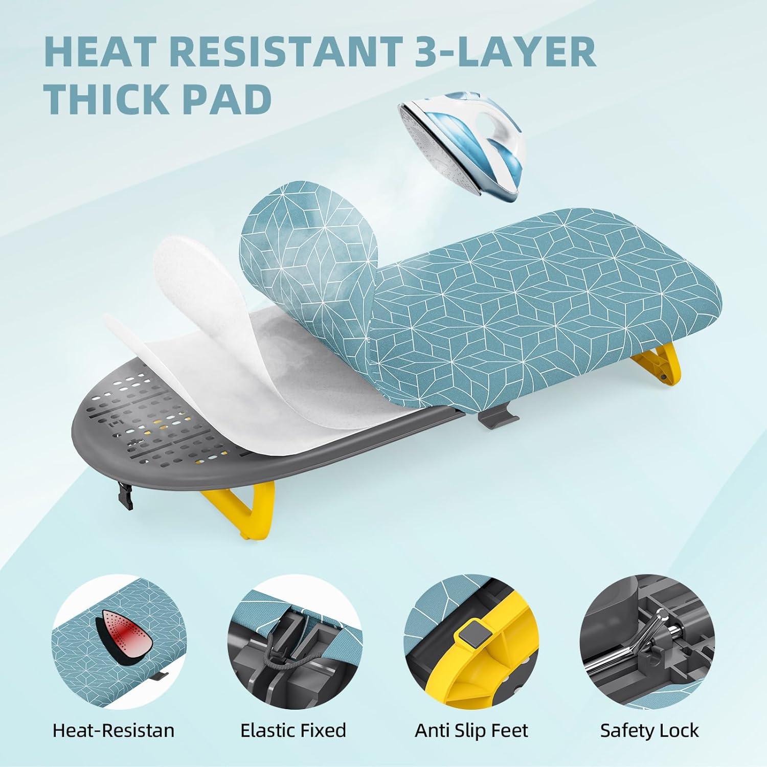 - [Detachable& Heat-Resistant Covers] Equipped with thick 100% cotton cover and padded felt, our mini ironing board provides good ventilation and super-smooth ironing. The covers of this compact portable ironing board can be detached for easy cleaning.