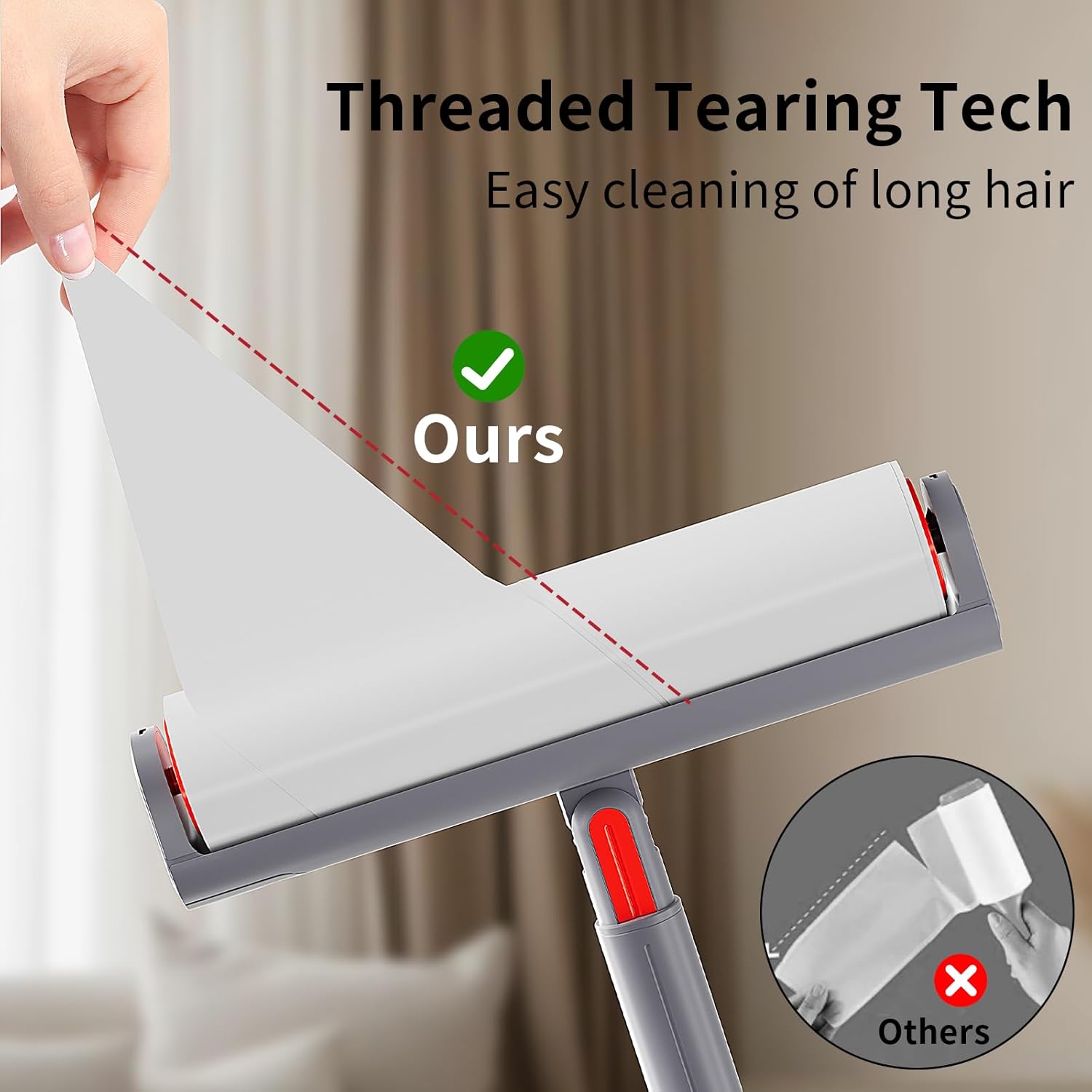 - Pragmatic Threaded Tear-off Design:Experience effortless cleaning of long hair with the pet hair remover sticky roller's threaded spiral design. Removing the top layer is a breeze - just lift and pull from the side of the large roller refill. The stick-it roller glides smoothly from one side to the other, featuring clear lines on the adhesive tape, ensuring easy identification of the cutting edge on the lint roller stick long handle while in use.