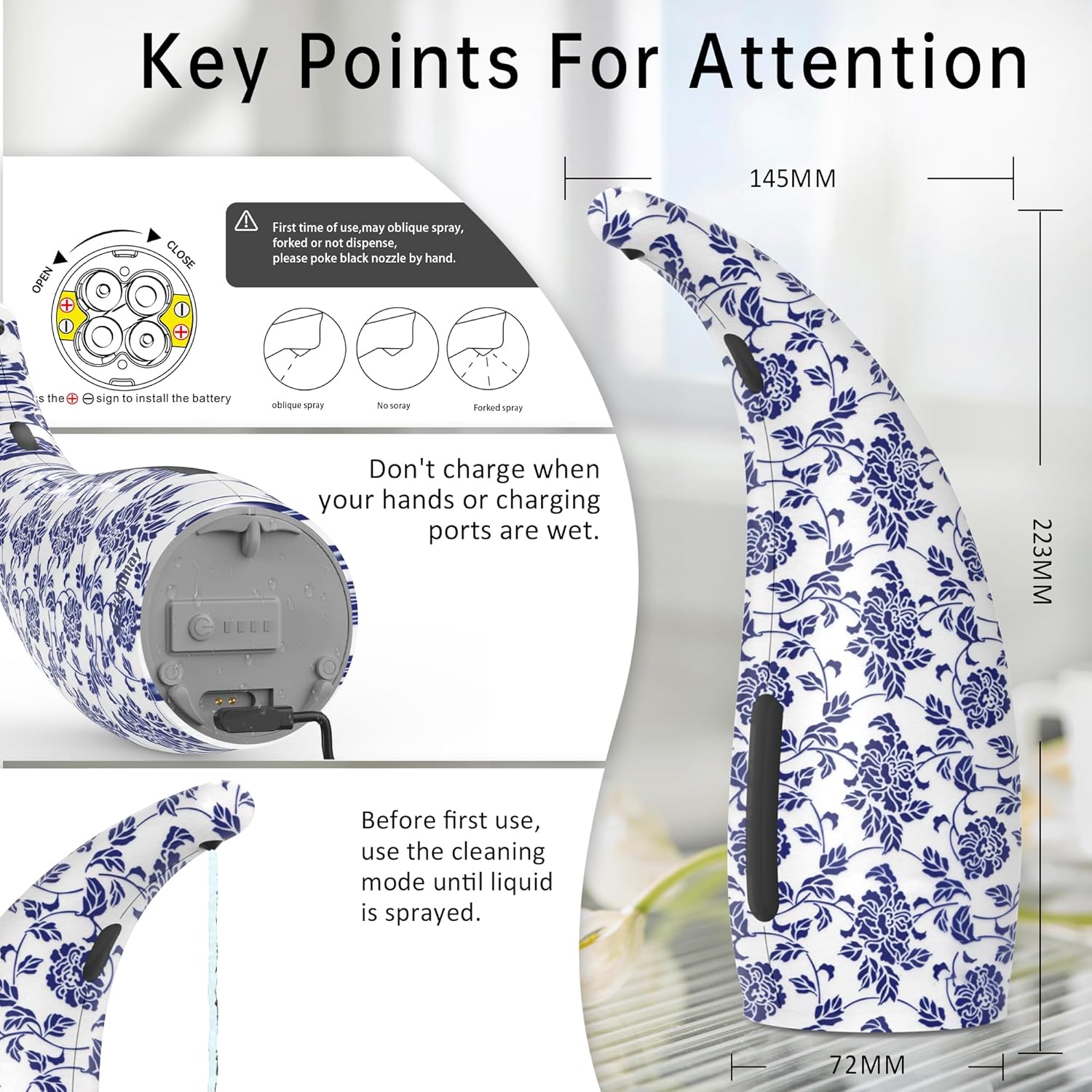 - Self-cleaning mode: Long press the switch for 10 seconds, you can enter the self-cleaning mode, and continue to spray soap liquid.