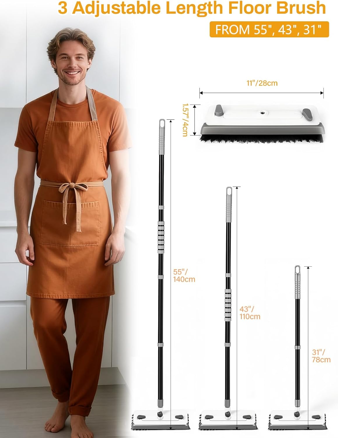 - ăErgonomic & Heavy-Duty Handleă The adjustable long handle extends from 31" to 55", allowing you to clean floors and high walls ergonomically without uncomfortable bending. Combined with the 45° angle, the sturdy iron pole lets you apply serious pressure without it breaking, making this a reliable bathroom scrubber for the toughest jobs.