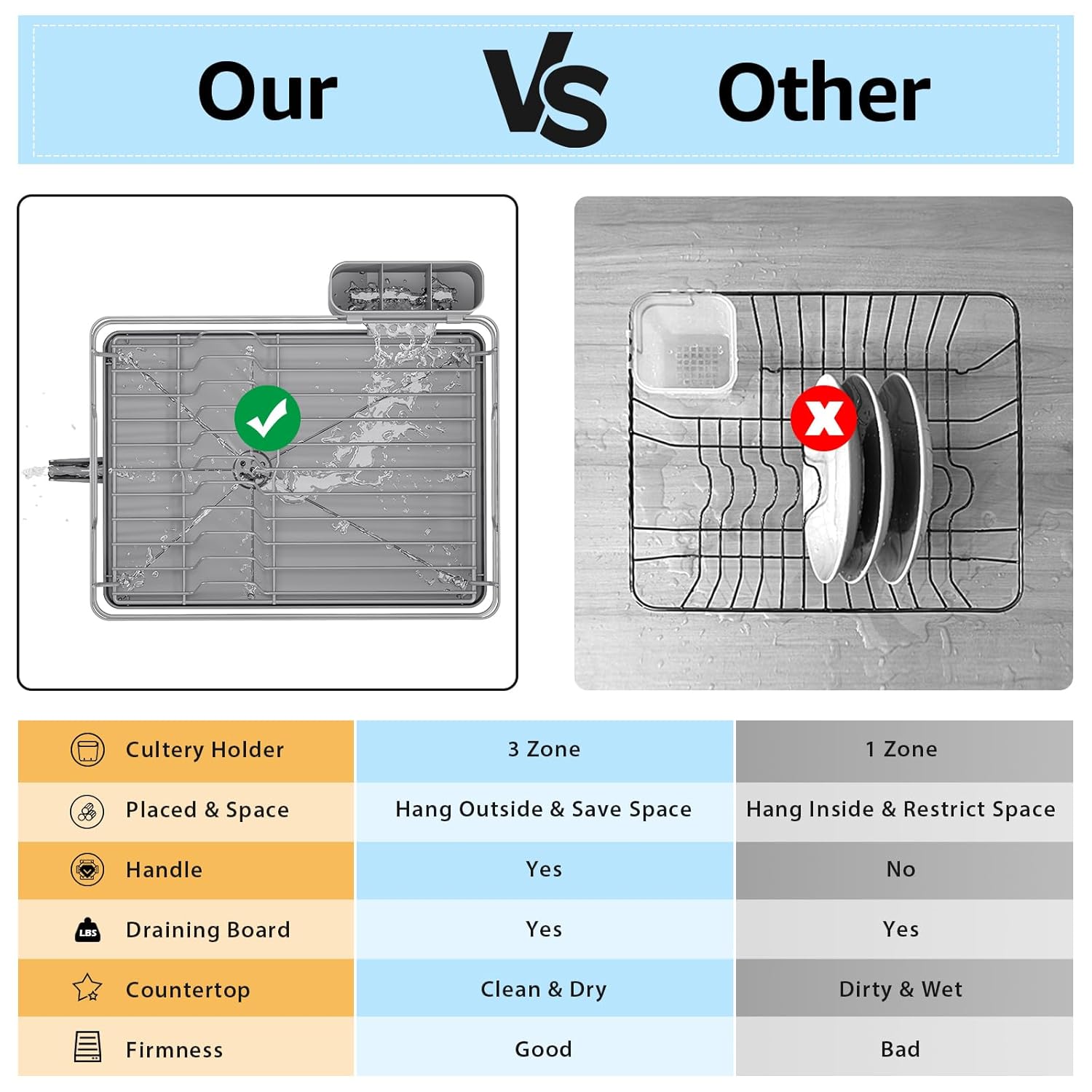 - 【Multifunctional Cutlery Holder Saves More Space】This dish drying rack for the kitchen counter features a hanging external cutlery holder, which frees up valuable space inside. The holder comes with a protruding drain outlet that guides water directly to the drainboard, ensuring efficient water management. It has 3 compartments to provide dedicated space for your forks, knives, and spoons, keeping your cutlery organized.