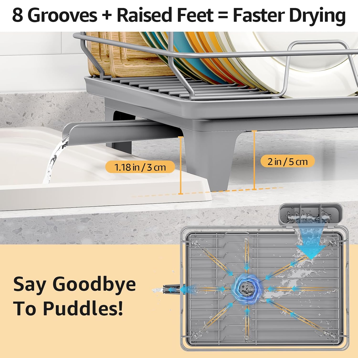 - 【Extra High Feet】 The high feet makes this dish drying rack for kitchen counter suitable for various sinks,and make the dish drying rack at a certain height from the sink, allowing water to flow smoothly into the sink, thereby keeping the kitchen dry and tidy