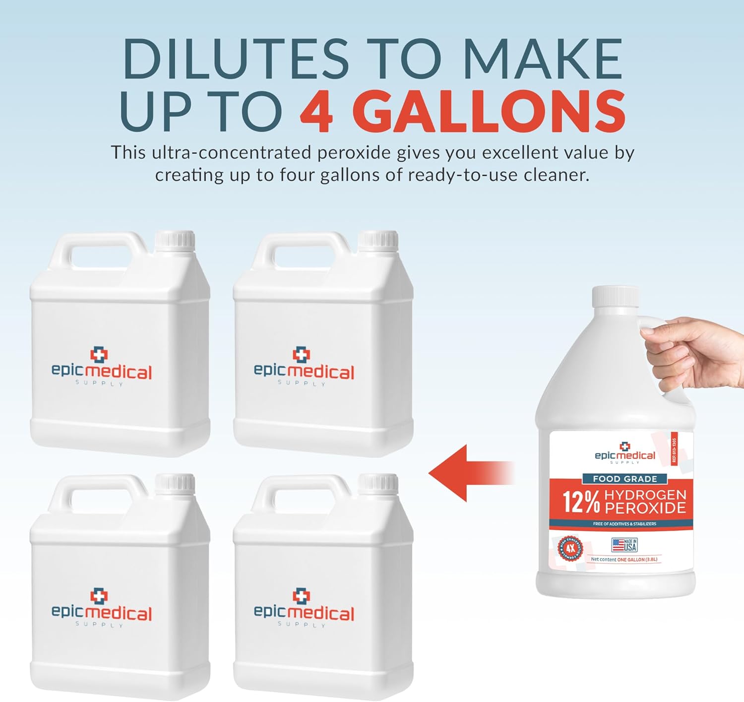 12% Food Grade Hydrogen Peroxide – Ultra-Concentrated H2O2 Peroxide Cleaner – 1 Gallon Bottle – Bleach Alternative for Household Cleaning, Laundry, Glass & More – Made in USA (1)