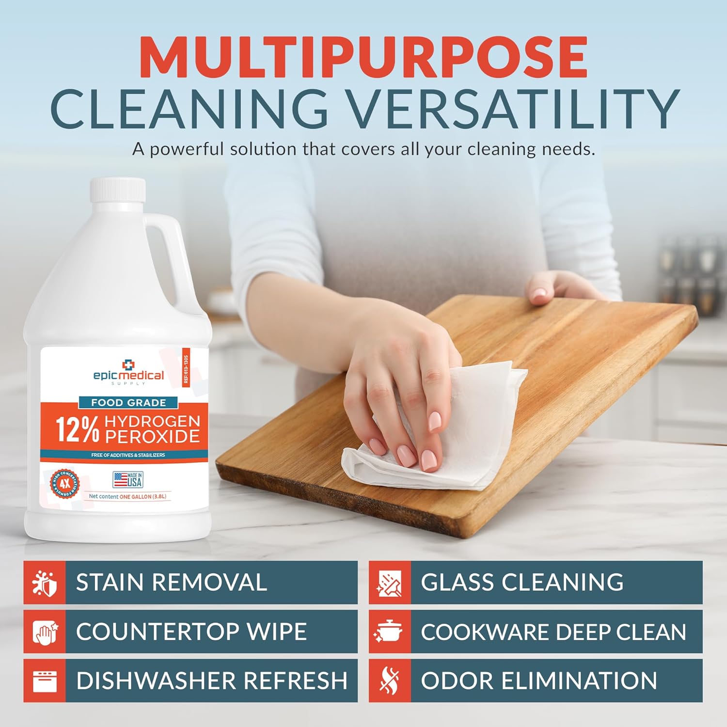 - FOOD-GRADE PURITY WITH NO ADDITIVES – made in the USA using only food-grade hydrogen peroxide and deionized water. This additive-free formula contains no stabilizers, fragrances, or harsh chemicals—offering a clean, straightforward solution for household cleaning tasks where product purity matters most
