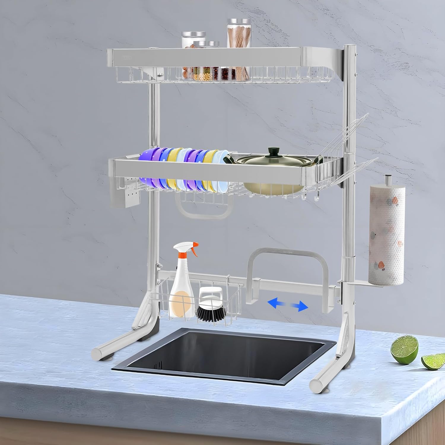 - 【Well-Considered Features】: With an adjustable width range of 20.94-33.07 inches, this product fits a variety of sink sizes. Its open-shelf design enhances accessibility and visibility, and the movable side accessories allow for convenient, personalized arrangements.