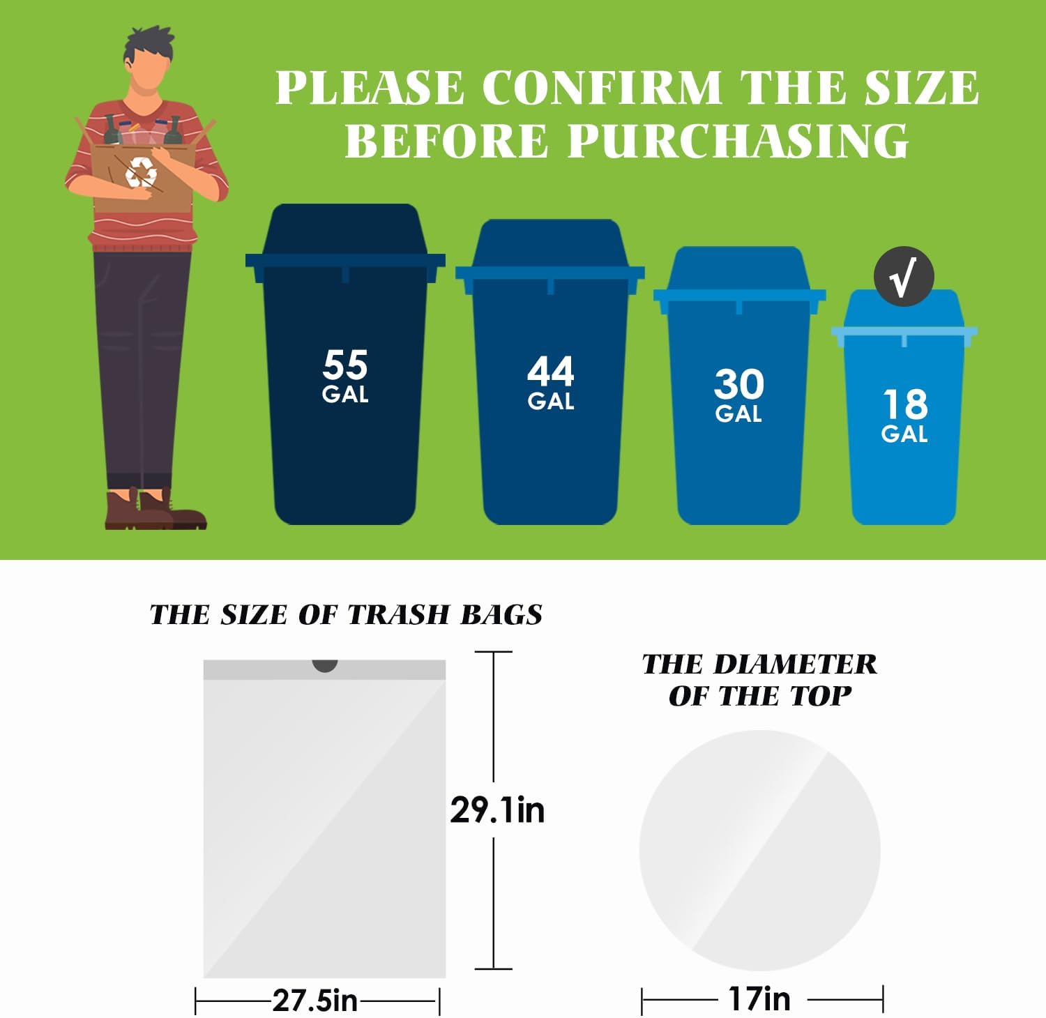 - Dimensions & Material:Our trash bags are crafted from high-quality HDPE,25 microns thick—tough, tear-resistant, and secure for all household waste.At 27.5"W × 29.1"L with a 18-gallon capacity, they fit widely. Ideal for kitchen food waste, large home areas (e.g., living rooms), and medium spaces (offices, storage rooms), reducing frequent bag changes.