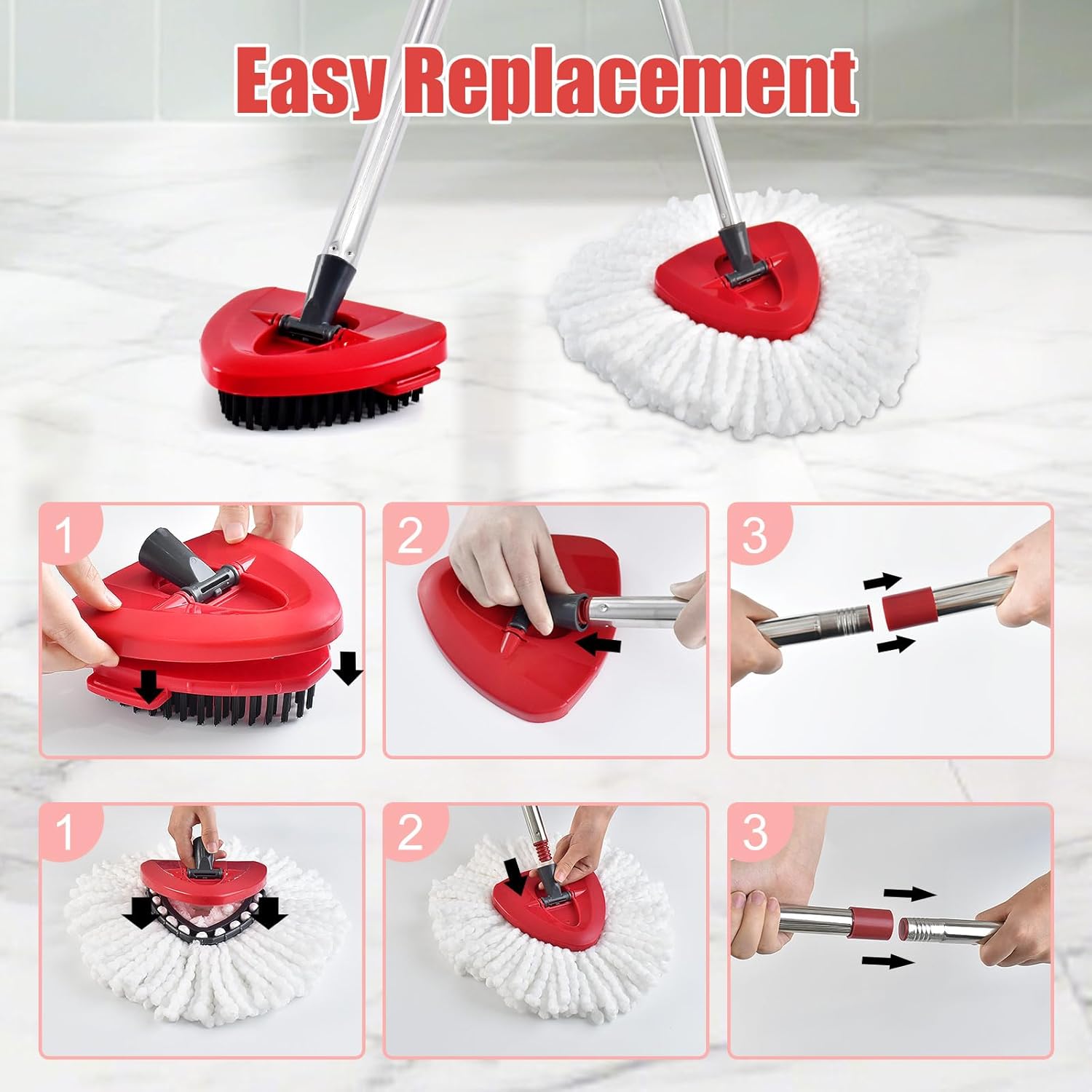- 【Set Includes】: 4-Section Stainless Steel Mop Handle 30-58 Inch Set (No Bucket), 2 Microfiber Mop Head Refills o-cedar mop refills, 1 triangle mop base and 1 spin mop scrub brush head. The adjustable compatible with O Cedar mop stick replacement comes with standard screws and can be used with most other brands of rotary mops and brooms