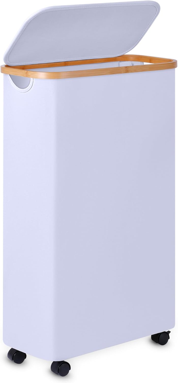 Slim Laundry Basket with Wheels,Narrow Hampers for Laundry,Freestanding Laundry Hamper with Lid&Bamboo Handles,Collapsible & Waterproof Tall Cloth Hamper for Dorm Family(60L White)