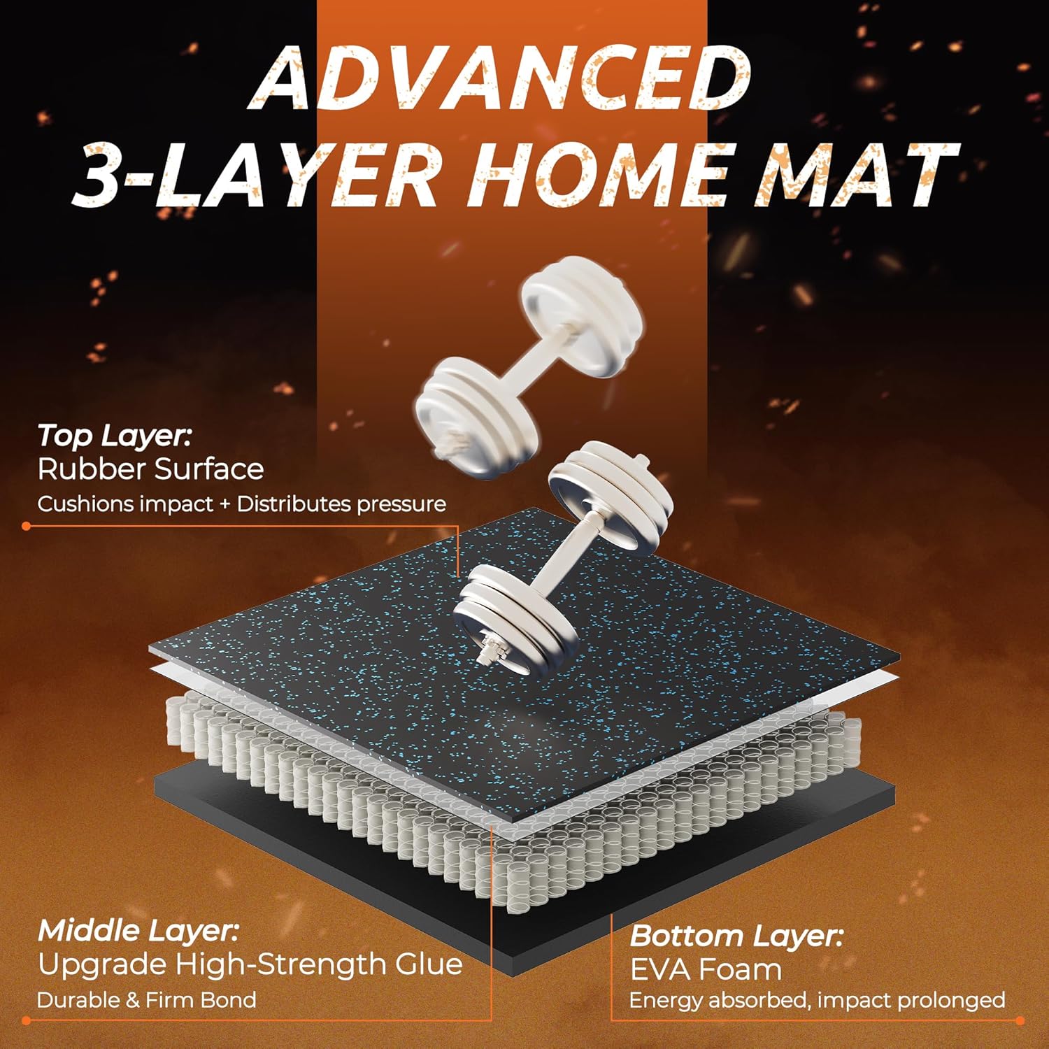 - 【0.6" Thick Upgraded 3-layer Rubber Mat】 At 0.6" thick, these gym flooring for home gym are thicker than most you’ll find. The 3-layer combo—durable rubber top, high-strength glue, and high density EVA foam—gives the perfect mix of support and durability. Plus, the rubber surface is water-resistant and easy to wipe clean
