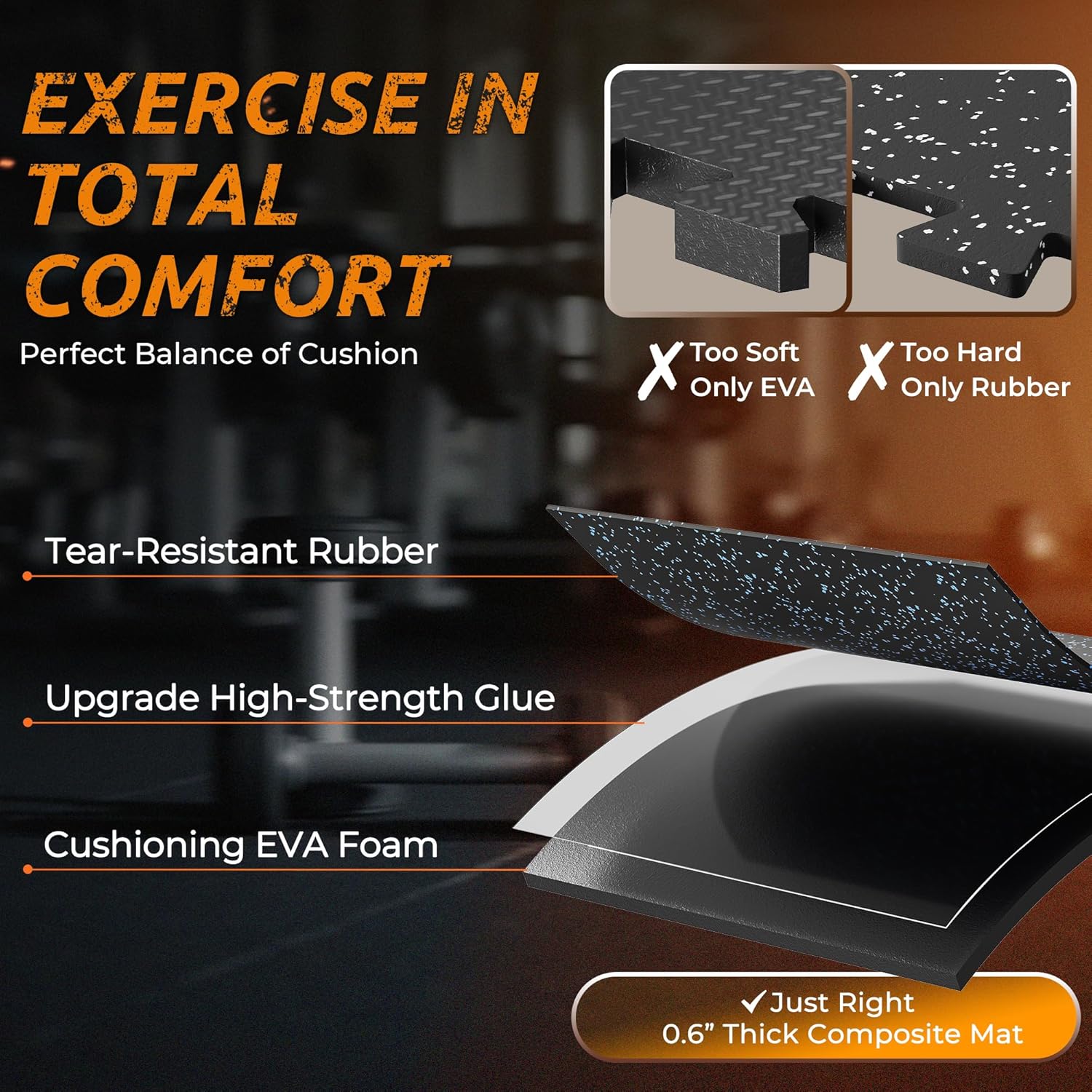 - 【0.6" Thick Upgraded 3-layer Rubber Mat】 At 0.6" thick, these gym flooring for home gym are thicker than most you’ll find. The 3-layer combo—durable rubber top, high-strength glue, and high density EVA foam—gives the perfect mix of support and durability. Plus, the rubber surface is water-resistant and easy to wipe clean