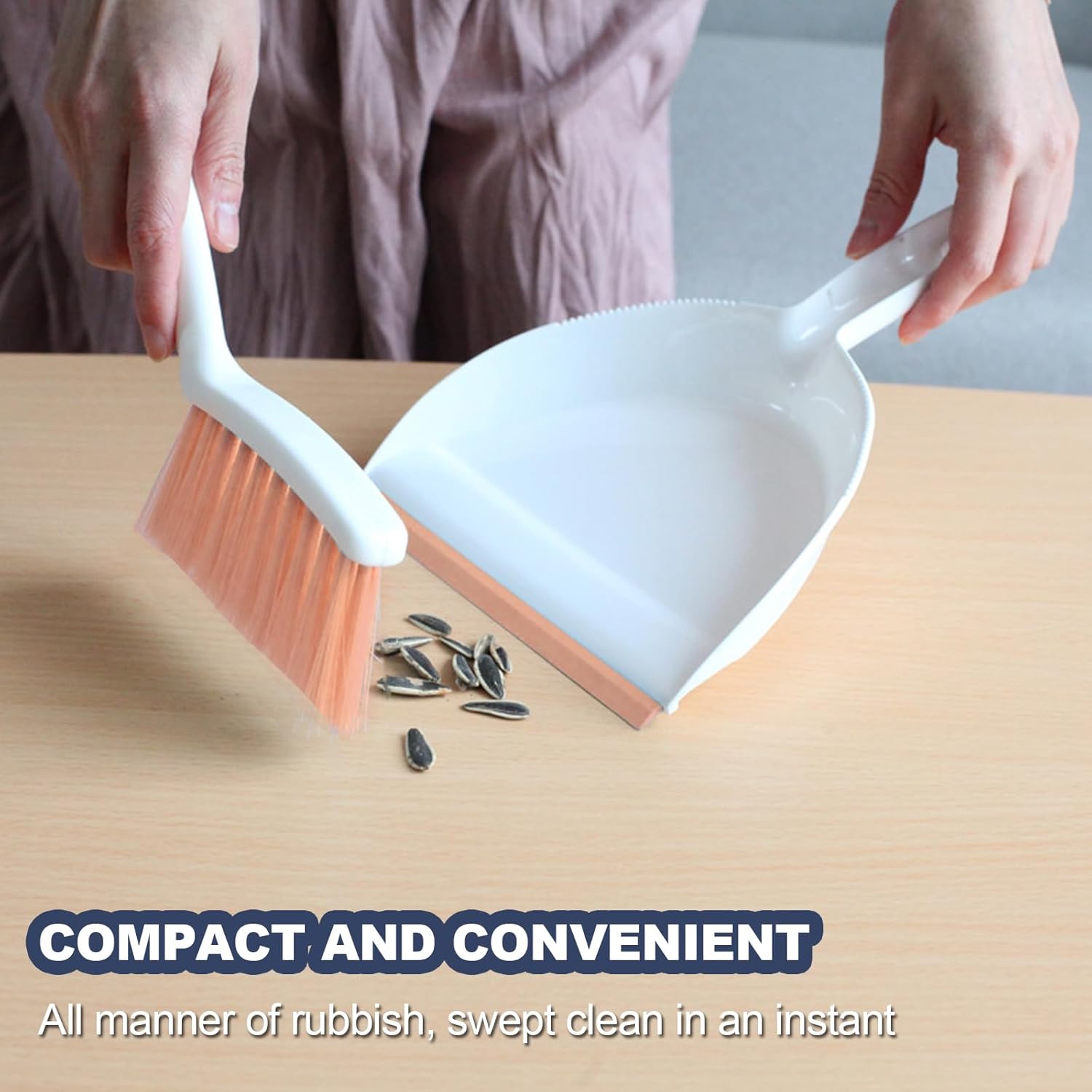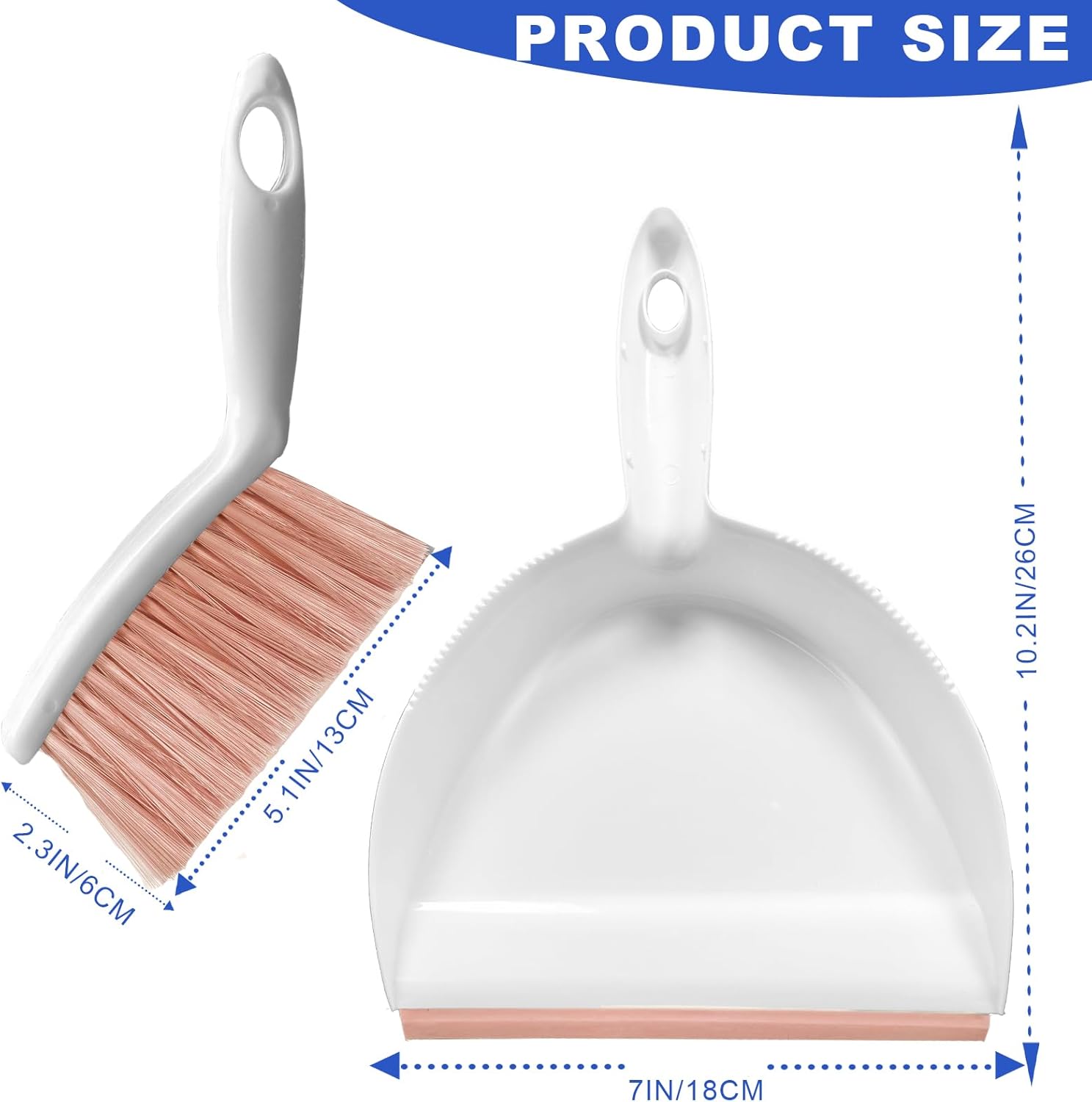 - 【Efficient Cleaning】Crafted from high-quality materials, this dustpan and broom combo is built to last. The dustpan is made of PP material and has an integrated rubber strip at the opening that fits snugly against the floor to prevent dust from falling out. The three rows of soft PET bristles are gentle yet effective, making them ideal for cleaning delicate surfaces such as countertops and furniture.