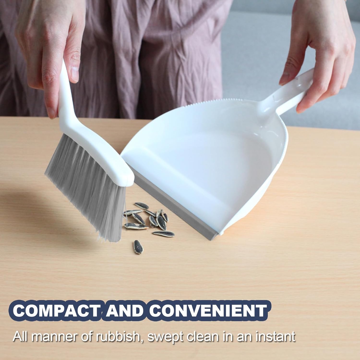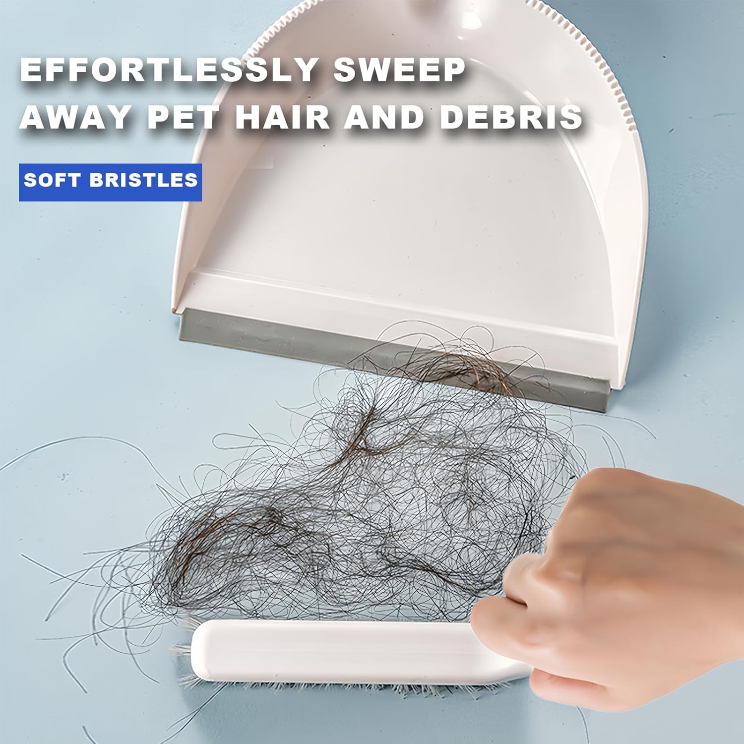 - 【Efficient Cleaning】Crafted from high-quality materials, this dustpan and broom combo is built to last. The dustpan is made of PP material and has an integrated rubber strip at the opening that fits snugly against the floor to prevent dust from falling out. The three rows of soft PET bristles are gentle yet effective, making them ideal for cleaning delicate surfaces such as countertops and furniture.