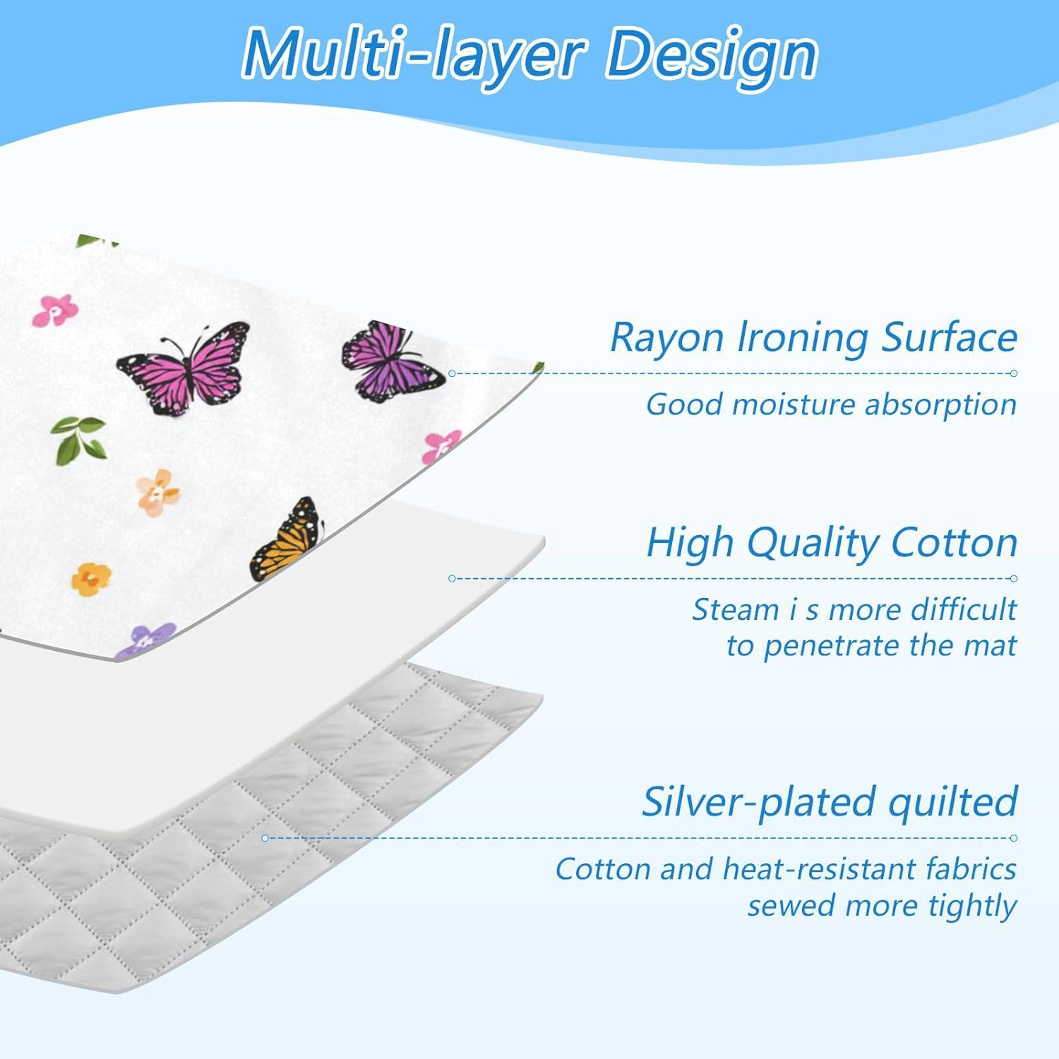 - High Quality:This ironing mat adopts a multi-layer design, with a surface made of Rayon lroning and good moisture absorption. High quality cotton in the middle makes it Steam more difficultto penetrate the mat. The bottom layer is coated with 210 silver-plated quilted, with cotton and heat-resistant fabricssewed more tightly. The ironing pad can be used on both sides, making it more durable