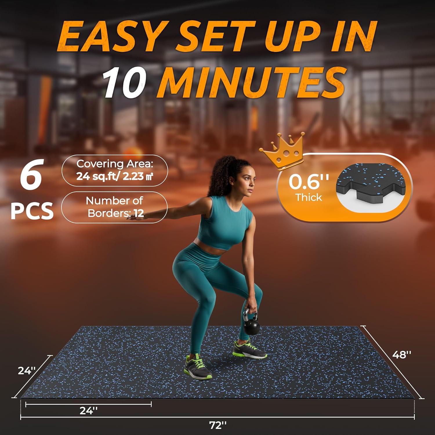 - 【Safe, Certified & Customizable】Made from SGS-certified, non-toxic materials, these exercise equipment mats are safe for you and your family. Each set includes 6 tiles (24" × 24" × 0.6"), covering 24 sq ft in total. Every tile comes with 2 borders for a neat, customizable finish