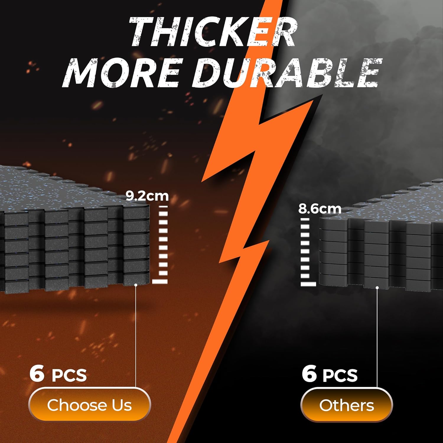 - 【0.6" Thick Upgraded 3-layer Rubber Mat】 At 0.6" thick, these gym flooring for home gym are thicker than most you’ll find. The 3-layer combo—durable rubber top, high-strength glue, and high density EVA foam—gives the perfect mix of support and durability. Plus, the rubber surface is water-resistant and easy to wipe clean