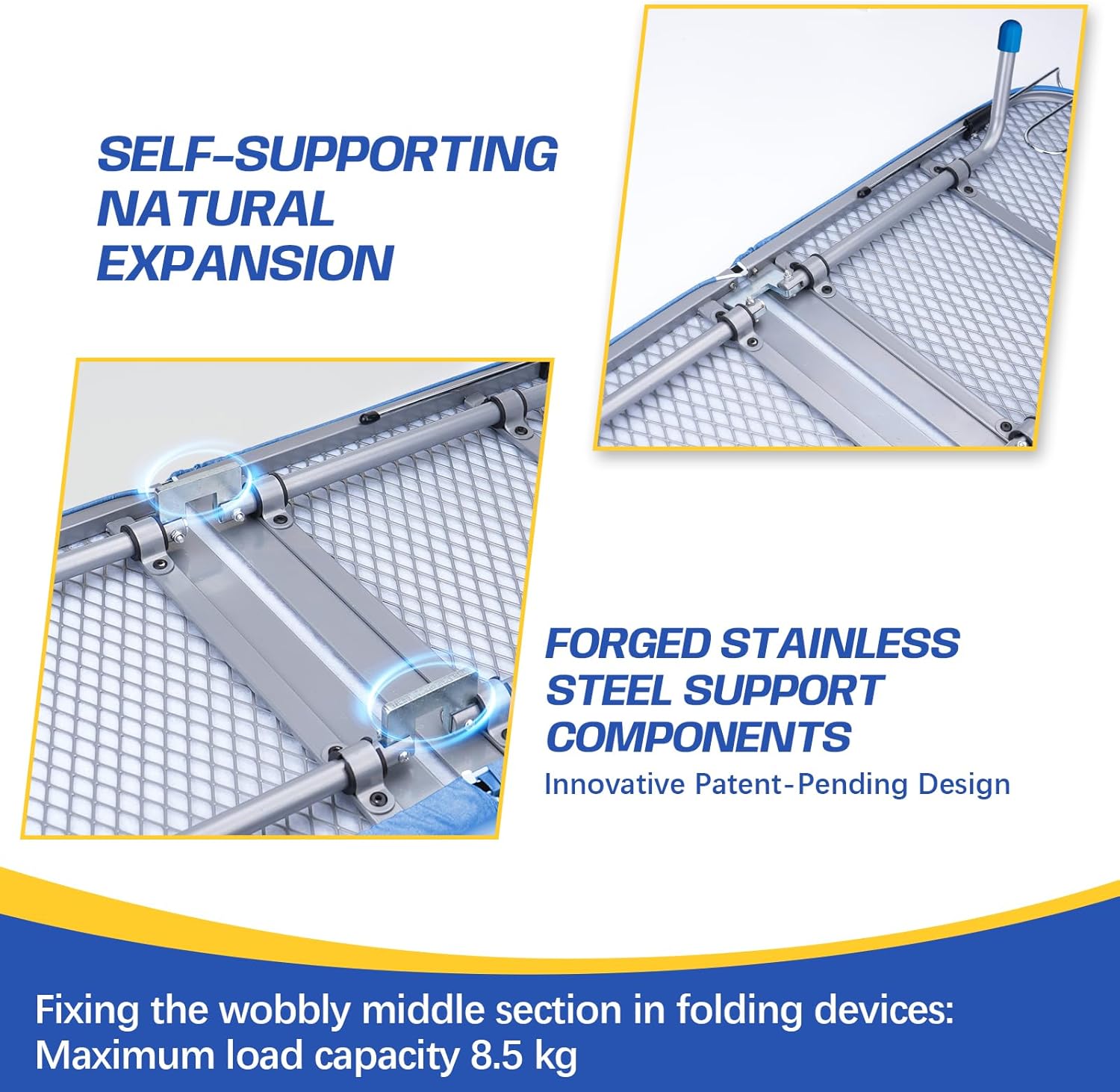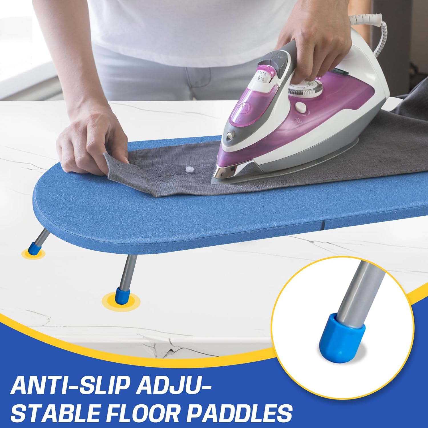 - 【Smooth-Surface Metal Mesh】The small ironing board with reinforced metal mesh ensures fast heat distribution for efficient ironing. Adjustable non-slip TRP feet protect floors and keep the board steady on uneven surfaces, while the breathable design prevents heat buildup.