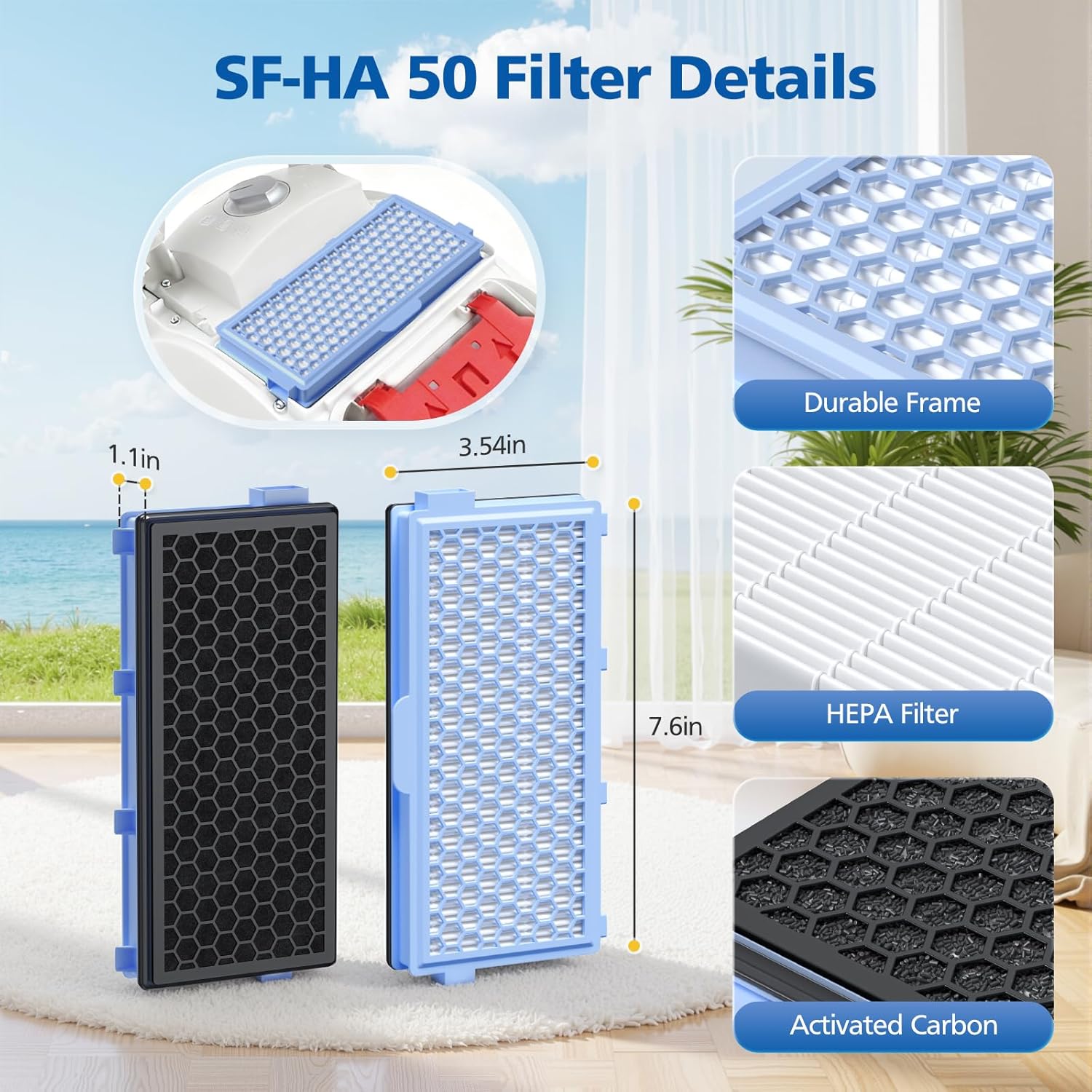 - 𝐑𝐄𝐆𝐔𝐋𝐀𝐑 𝐑𝐄𝐏𝐋𝐀𝐂𝐄𝐌𝐄𝐍𝐓:The package includes 4 pack SF-HA 50 HEPA filters. To ensure optimal performance, it is recommended to replace the filter every 3 months, depending on usage. Note: Do not let the activated carbon layer on the back of the filter get wet. If cleaning is needed, dry it completely before reuse. Filter made of FSC-Certified paper.