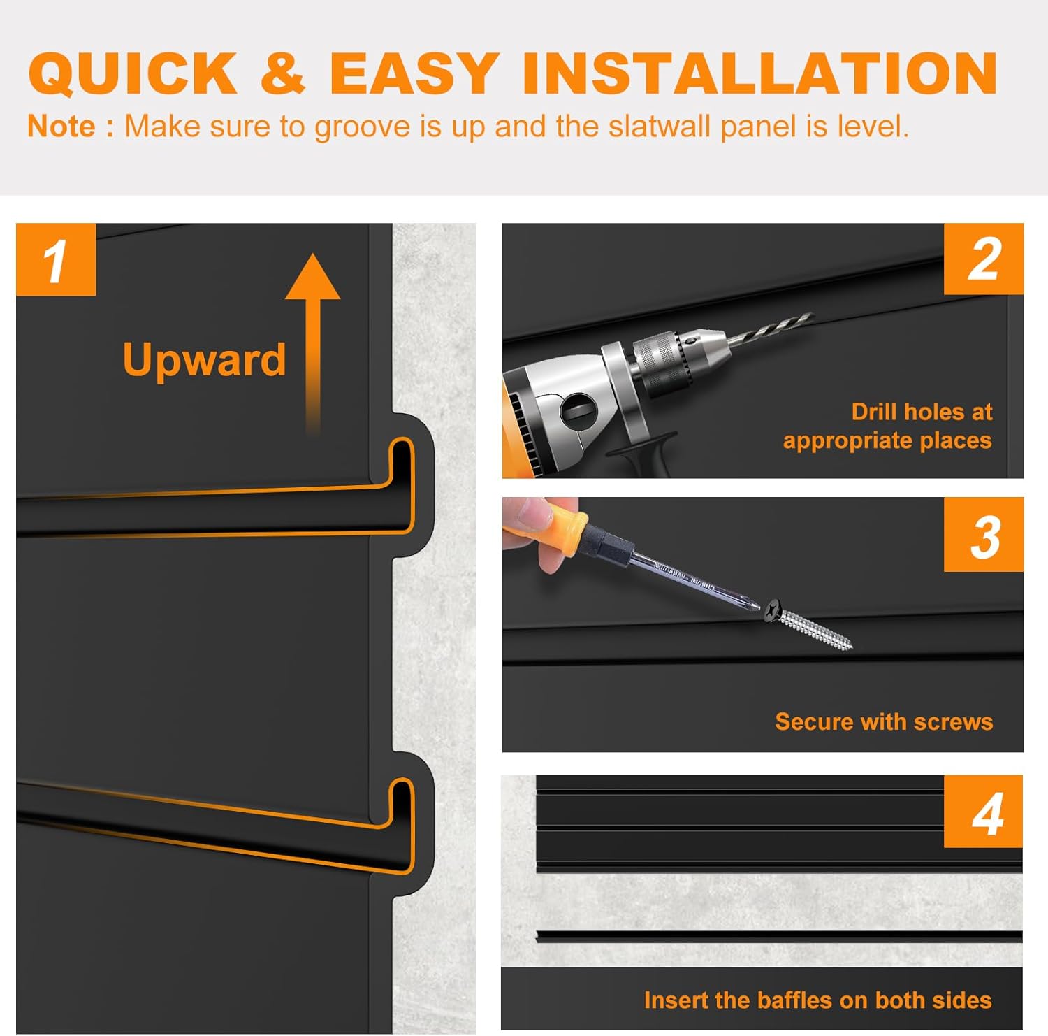 - Easy to Install: Each of our slatwall panels is composed of 2/4/8 pieces of 4ftx2ft, 4ftx4ft, 4ftx7.5ft purchase size, to provide you with a variety of choices. Installation can be done quickly with tools such as a level and rechargeable drill. If you need more load-bearing capacity, install more screws